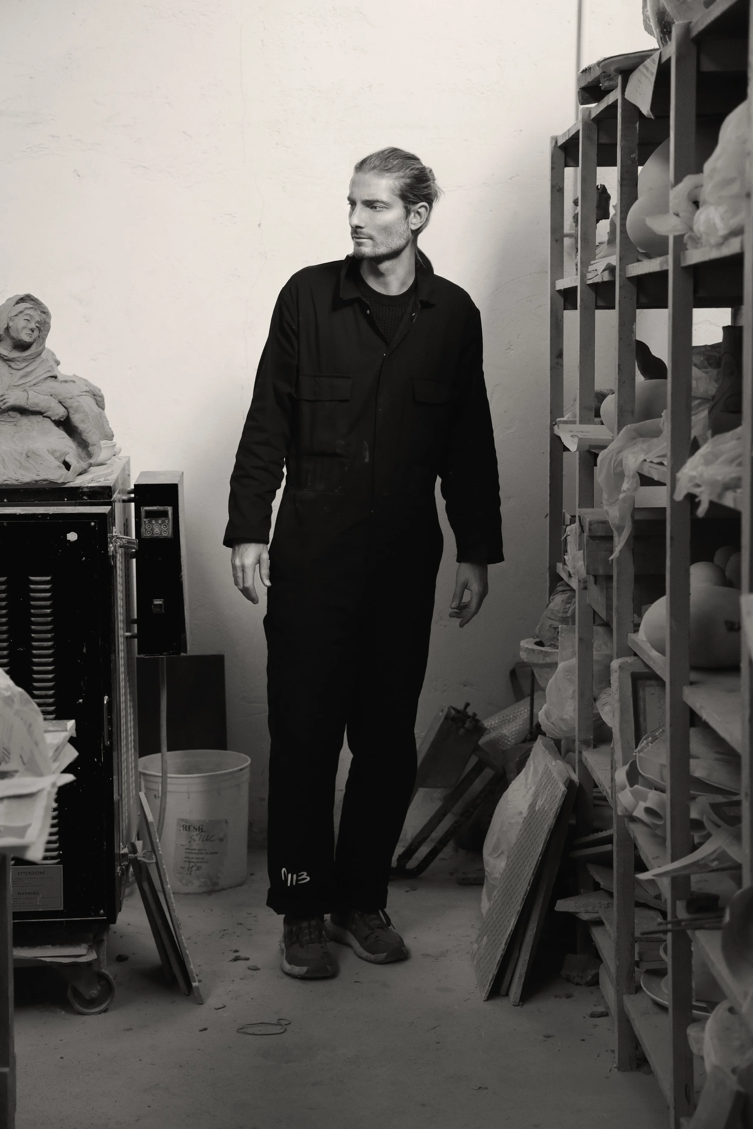 His research focuses on the dialogue between shadows and volumes, resulting in sculptures that often take the form of monoliths. These works reveal a dual nature: minimalist and essential from a distance, yet unveiling hidden complexities and hand-stitched brass details upon closer inspection—the fruit of a meticulous study into the essence of form.